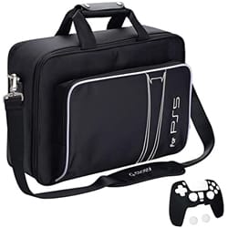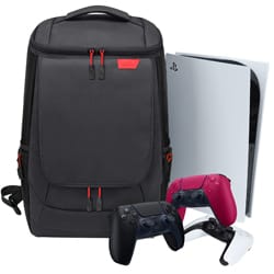 Para una opción súper versátil y conveniente, no te puedes equivocar con esta mochila duradera, diseñada específicamente para el jugador en movimiento. El elegante diseño negro es tan práctico como elegante y cuenta con tres compartimentos separados: un compartimento principal acolchado con dos cinturones para asegurar su consola, un compartimento central para controladores y auriculares, y un tercer bolsillo para accesorios más pequeños como discos y cables. Aunque el exterior es suave y acolchado, el material ultraduradero es resistente al agua y protegerá su PS5 de colisiones, rayones, polvo y lluvia.
