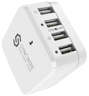 El cargador de pared USB Syncwire es un adaptador liviano, compacto y portátil con cuatro puertos USB. Tiene un enchufe estadounidense plegable y enchufes intercambiables para la UE y el Reino Unido. Este cargador detecta el tipo de dispositivos que están conectados y produce la corriente de carga óptima para ayudar a cargar los dispositivos más rápido. Cuenta con un sistema de seguridad Multi-Protect que incluye prevención de cortocircuitos, control de temperatura, protección contra sobretensiones y más. Con un peso de solo 6,7 onzas y unas medidas de 2,2” x 1,6” x 2,4”, puede usar fácilmente el cargador de pared USB Syncwire para cargar todo, desde su teléfono hasta sus parlantes bluetooth.