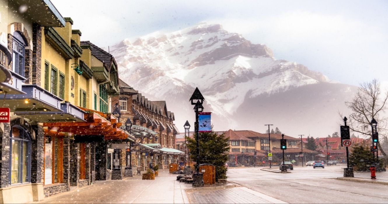 Nieve cayendo en una calle de la ciudad de Banff, Alberta, Canadá, en las Montañas Rocosas Canadienses