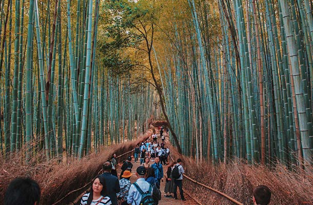 El siguiente en nuestra lista es el hermoso bosque de bambú de Arashiyama. Al llegar aquí a primeras horas de la tarde, el lugar se llena de visitantes.