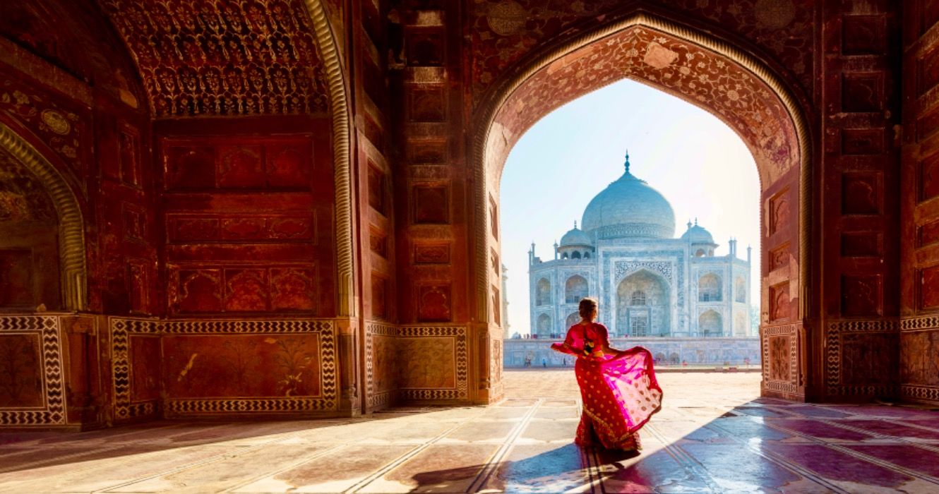 Mujer en sari/sari rojo en el Taj Mahal, Agra, Uttar Pradesh, India