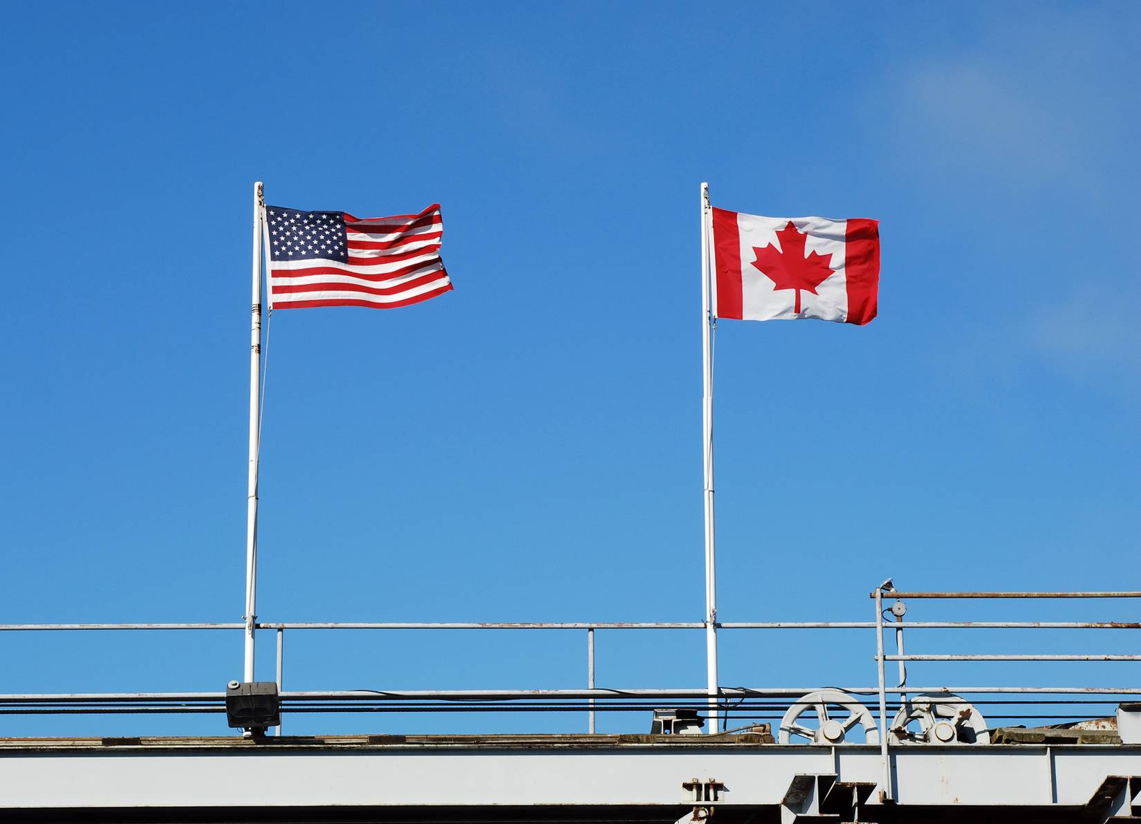 Banderas ondeando en la frontera entre Estados Unidos y Canadá