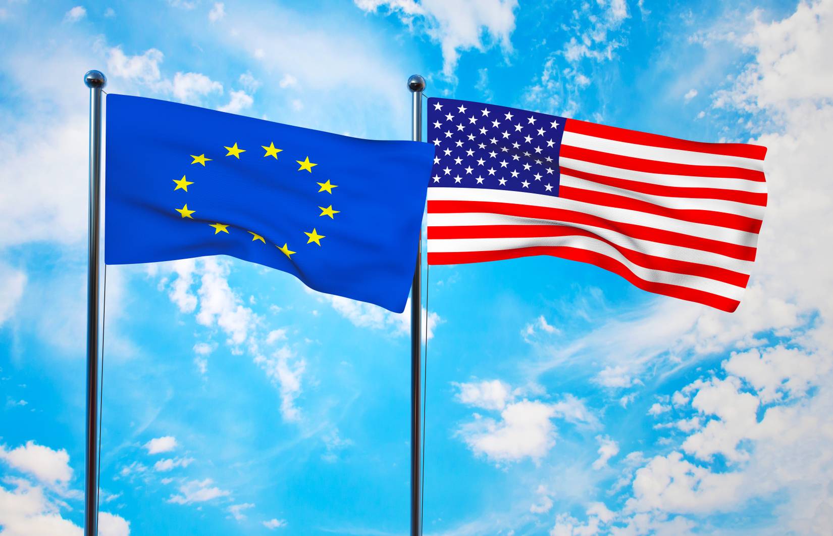 Banderas de la Unión Europea y Estados Unidos contra un cielo azul