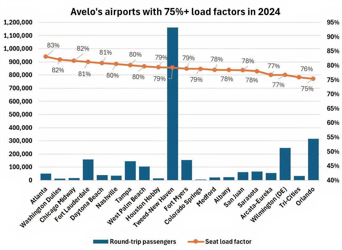 Avelo voló a 61 aeropuertos en 2024, tiempo durante el cual, como se mencionó anteriormente, la carga promedio de su red fue del 75%. Relacionar esto con los aeropuertos muestra que 20 lograron al menos esto como mínimo, como se destacó anteriormente. Con el 83%,Atlantaocupó el primer lugar en este sentido, aunque estaba muy por debajo del 90% o más logrado por la mayoría de las compañías europeas de bajo coste/ultra bajo coste. Con 51.000 pasajeros de ida y vuelta, Atlanta era sólo el 24º aeropuerto más grande de Avelo por volumen de tráfico.