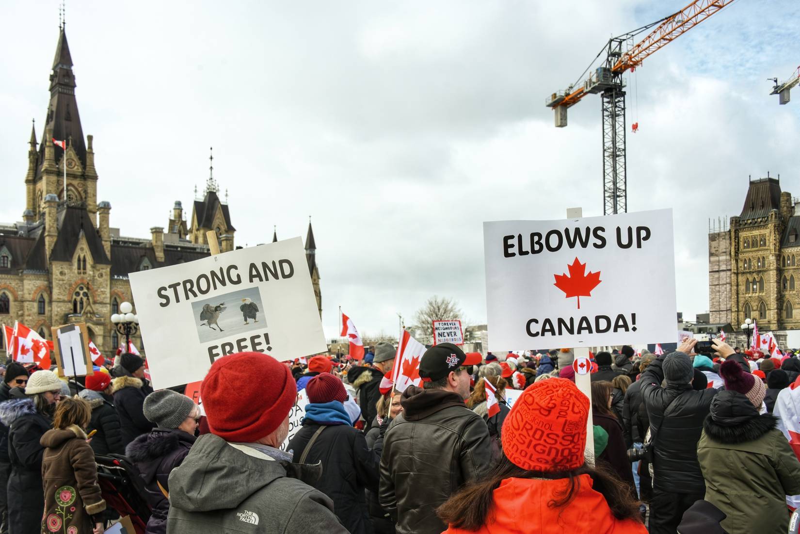 Manifestantes en una manifestación “Elbows Up” en Canadá. Crédito: Paul McKinnon / Shutterstock.com
