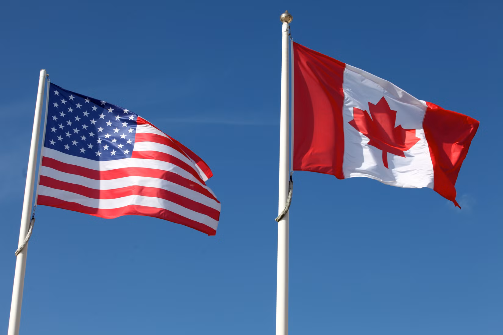 Banderas estadounidenses y canadienses ondeando contra un cielo azul. Crédito: vía Shutterstock