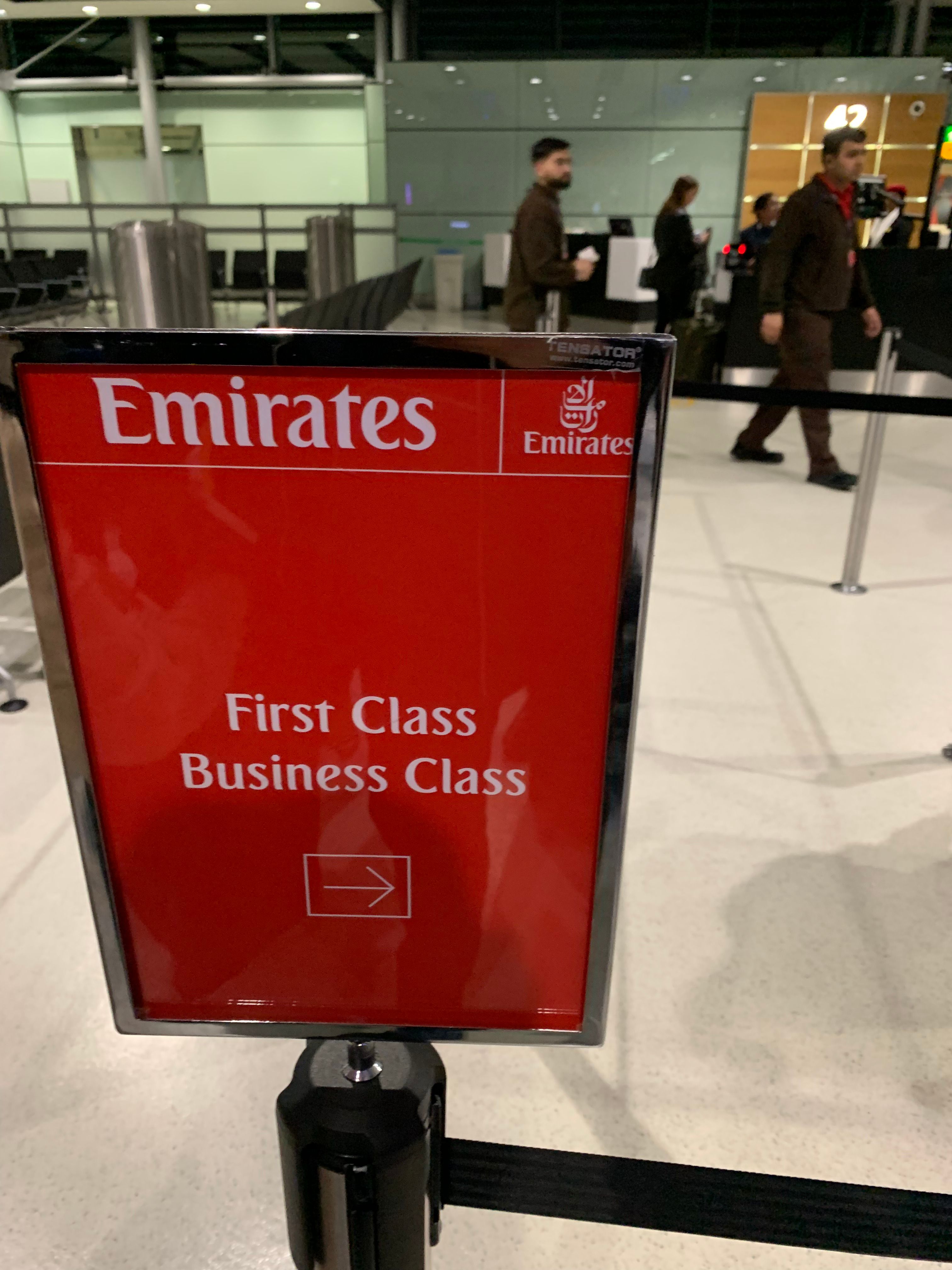 El embarque en la puerta comenzó una hora antes de la salida, lo cual fue bueno teniendo en cuenta que el vuelo estaba casi lleno. Sin embargo, la puerta contaba con personal adecuado y se proporcionó una sección separada para los pasajeros de primera clase y clase ejecutiva junto con los miembros Silver, Gold y Platinum de Emirates Skywards.