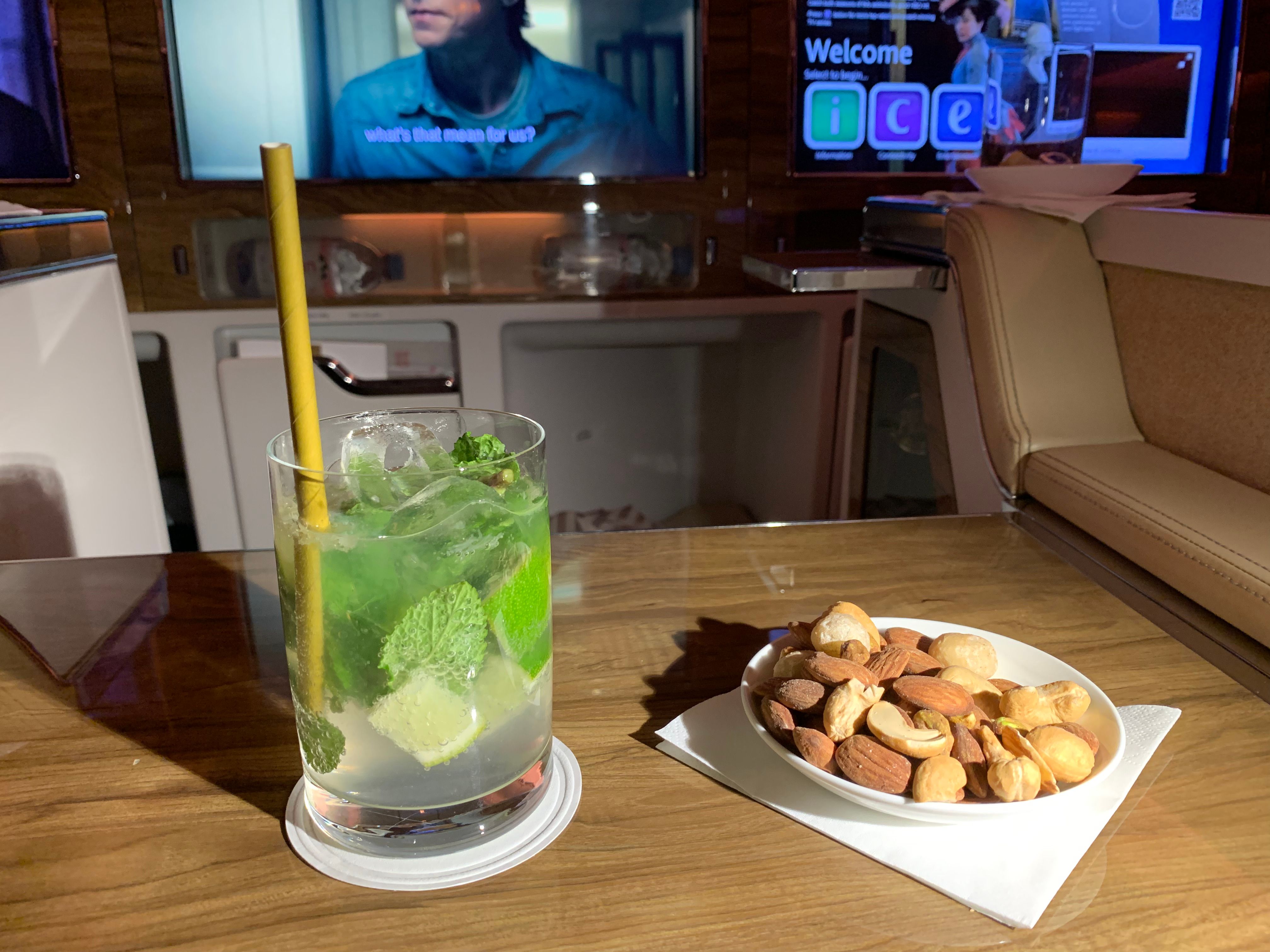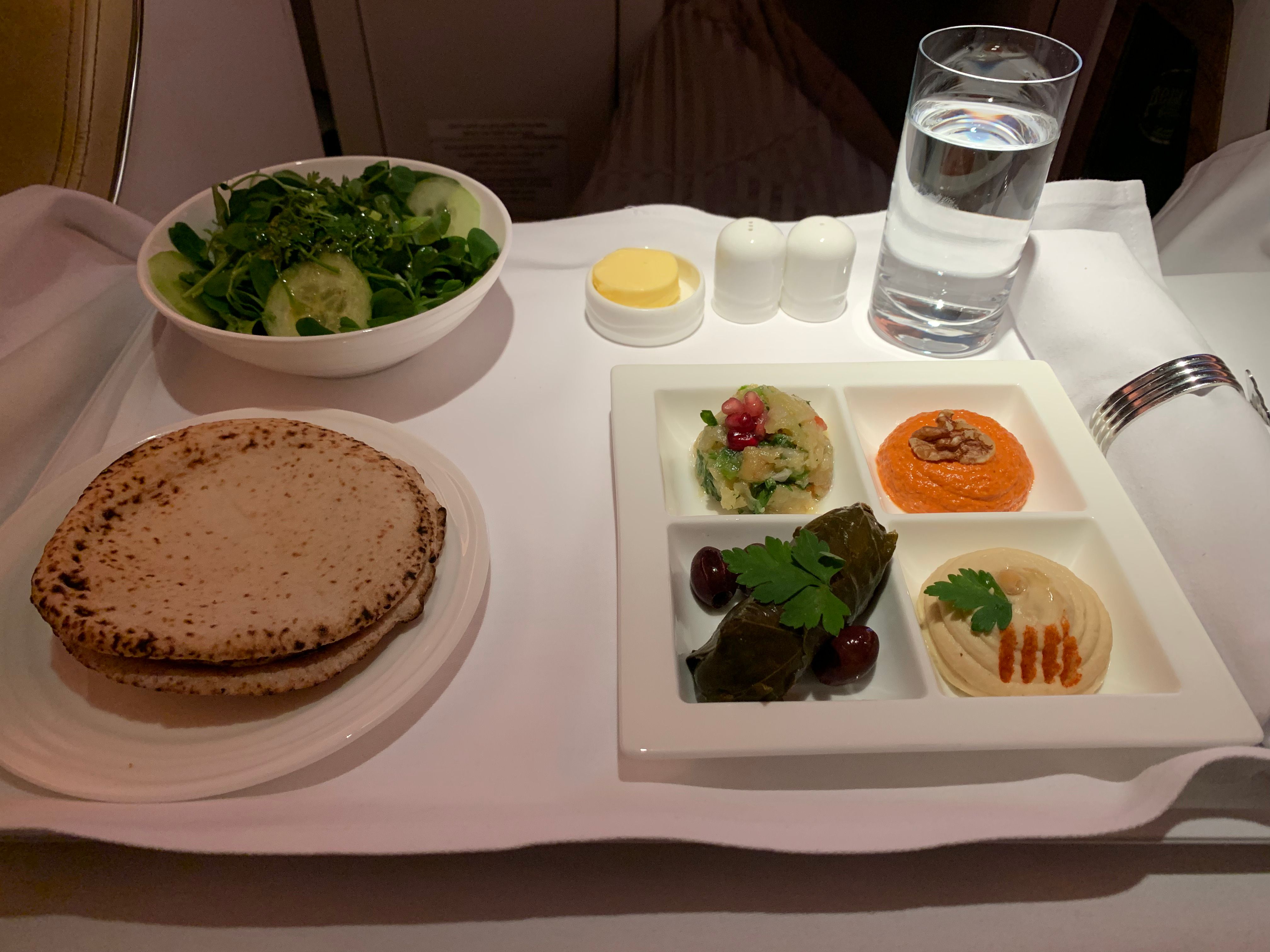Para la copa de después del despegue, tomé un vaso de mojito virgen junto con un mix de frutos secos. Para la cena de tres platos, elegí el tradicional mezze árabe como aperitivo, el filete de ternera braseado como plato principal y la tarta de queso con chocolate blanco como postre. La cena se sirve con un plato de ensalada fresca y una selección de panes calientes.