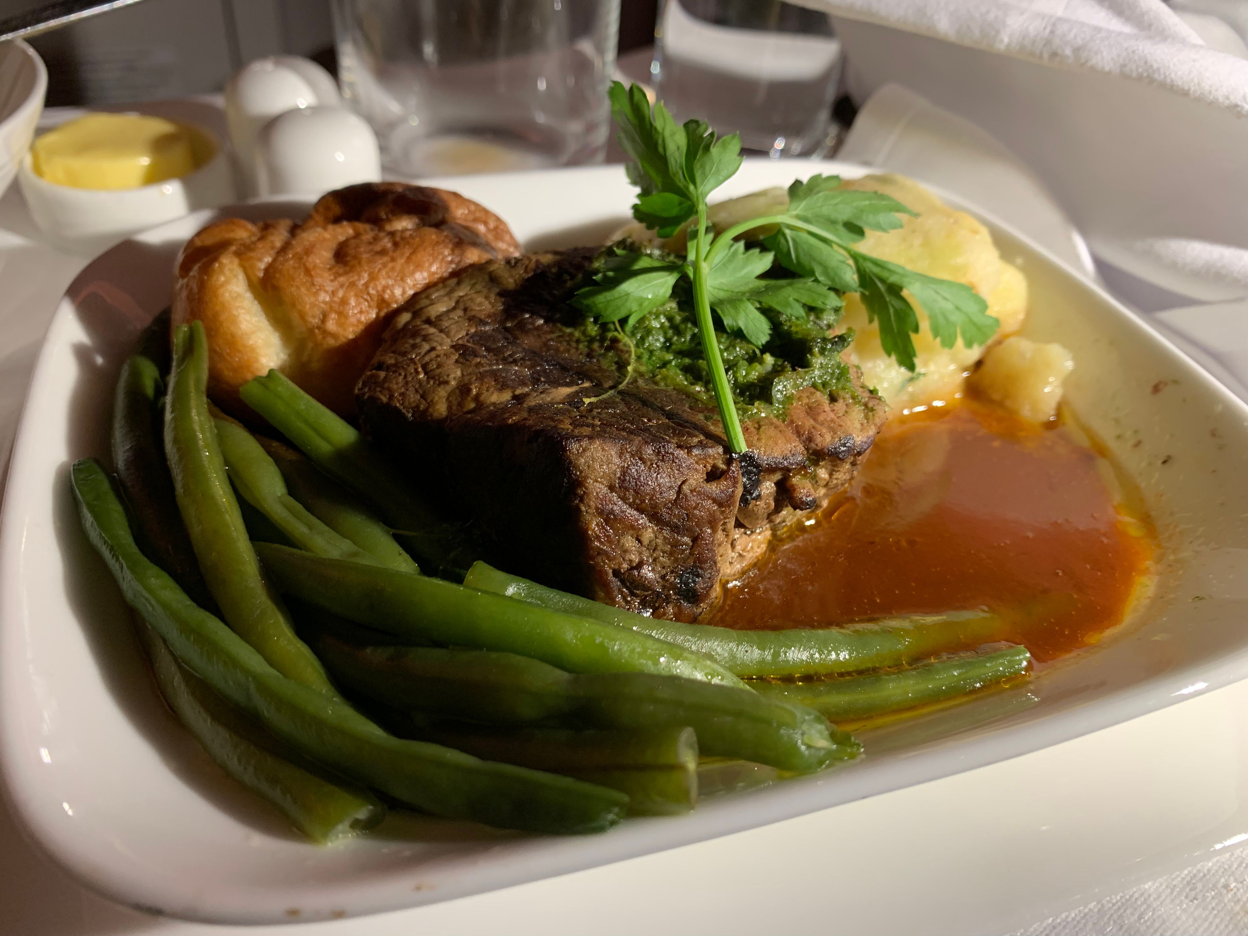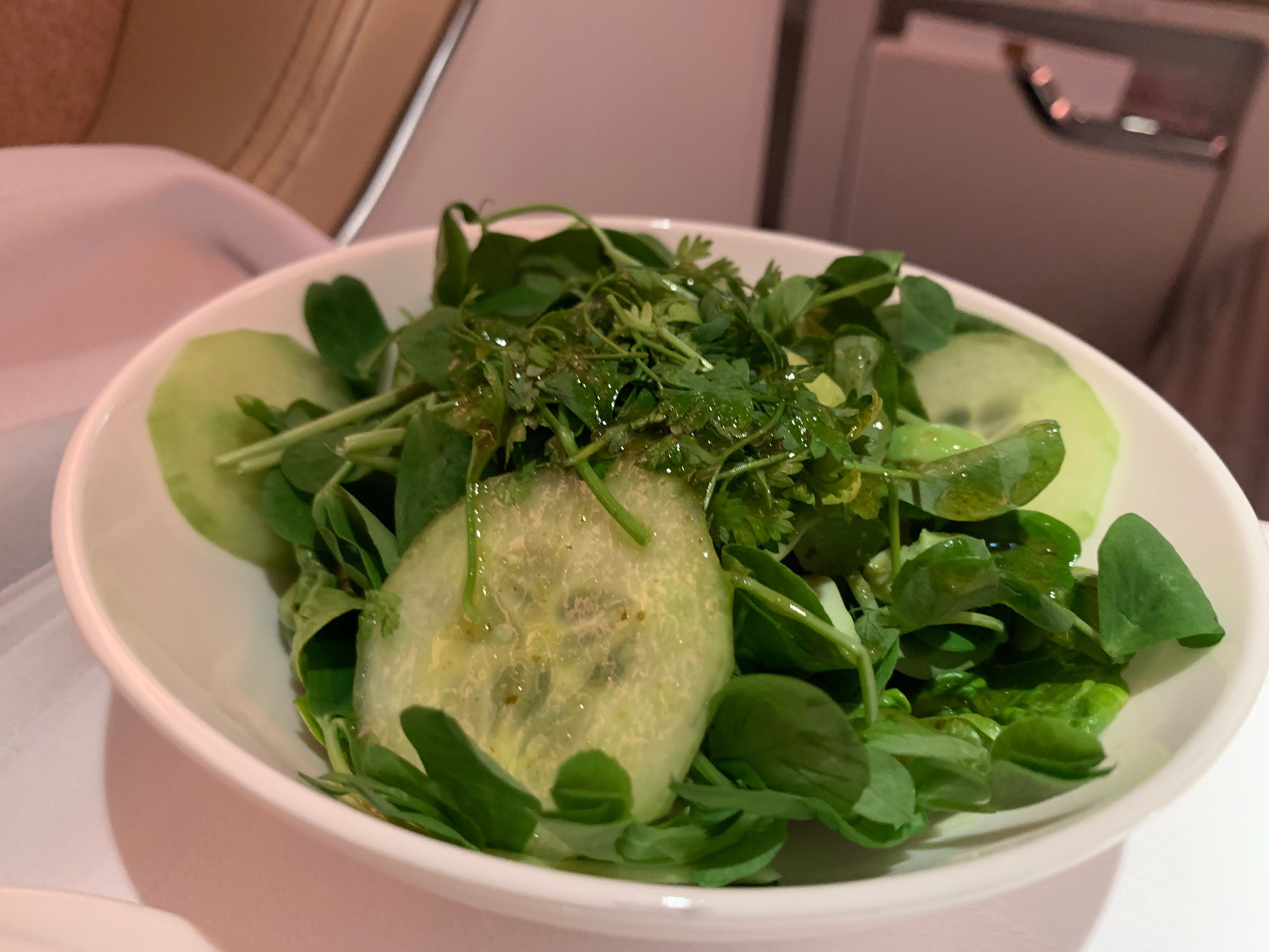 La comida estuvo deliciosa y se sirvió con excelente presentación y cubiertos de metal. Otra cosa que destaca del catering a bordo de Emirates es que las porciones de comida son siempre del tamaño adecuado. La porción no es tan pequeña como para que los pasajeros quieran más, pero tampoco es tan grande como para que los pasajeros tengan dificultades para terminar la comida.