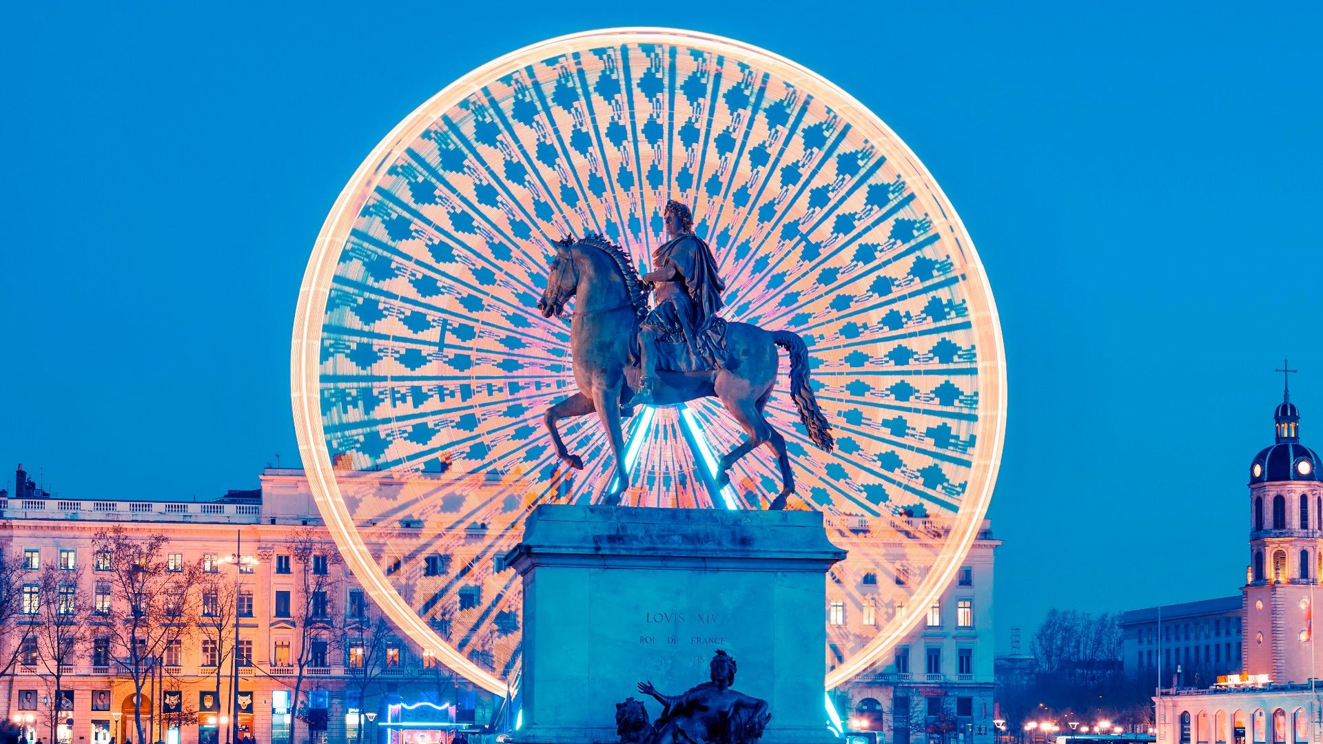 Place Bellecour estatua del rey Luis XIV por la noche, Lyon Francia