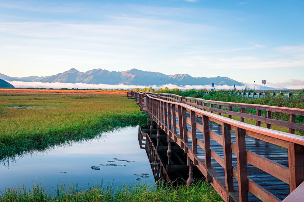 Un paseo marítimo de madera en Potter Marsh Bird Sanctuary, Alaska