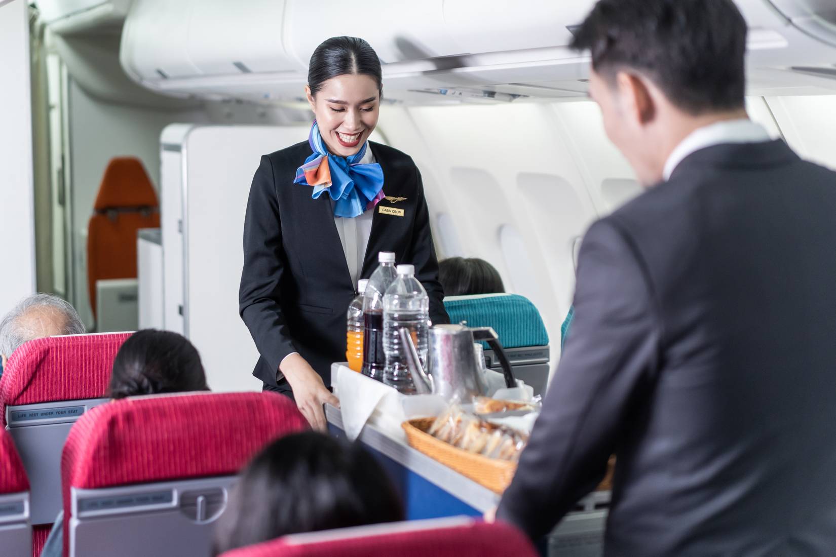 Asistentes de vuelo que sirven comida y bebidas en un avión. Crédito: Shutterstock