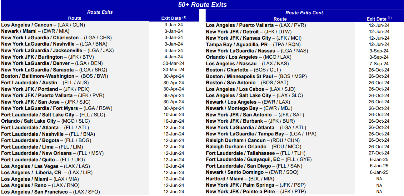 Algunas de las rutas que han sido eliminadas de su red desde principios de este año incluyen Los Ángeles-Cancún, Nueva York LaGuardia-Jacksonville, Nueva York JFK-Portland, Fort Lauderdale-Nashville, Nueva York JFK-Detroit y Los Ángeles-Puerto Vallarta, entre docenas de otras, como se muestra a continuación. En total, más de 50 rutas serán eliminadas hasta enero de 2025.