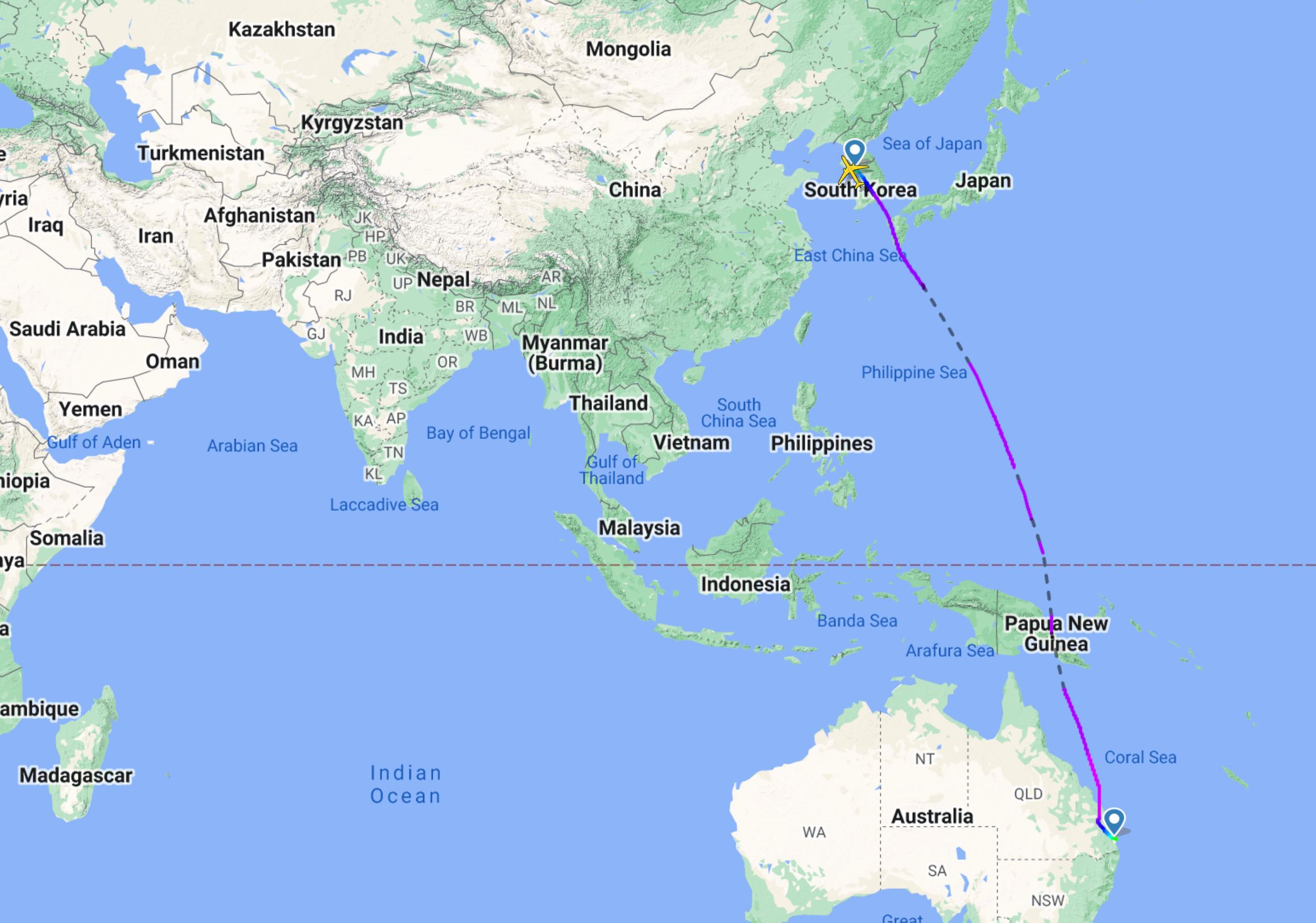 El jueves, el vuelo JQ53 de Jetstar despegó del aeropuerto de Brisbane (BNE) a las 12:01 en un vuelo de 9:14 horas que aterrizó en Seúl Incheon International (ICN) a las 20:14. Jetstar utilizó un Boeing 787-8 Dreamliner 2015, matrícula VH-VKK y MSN 36237, que recientemente voló entre Sydney y Seúl y a otros destinos internacionales, incluidos Honolulu (HNL), Ho Chi Minh City (SGN), Phuket (HKT) y Bali Denpasar (DPS).