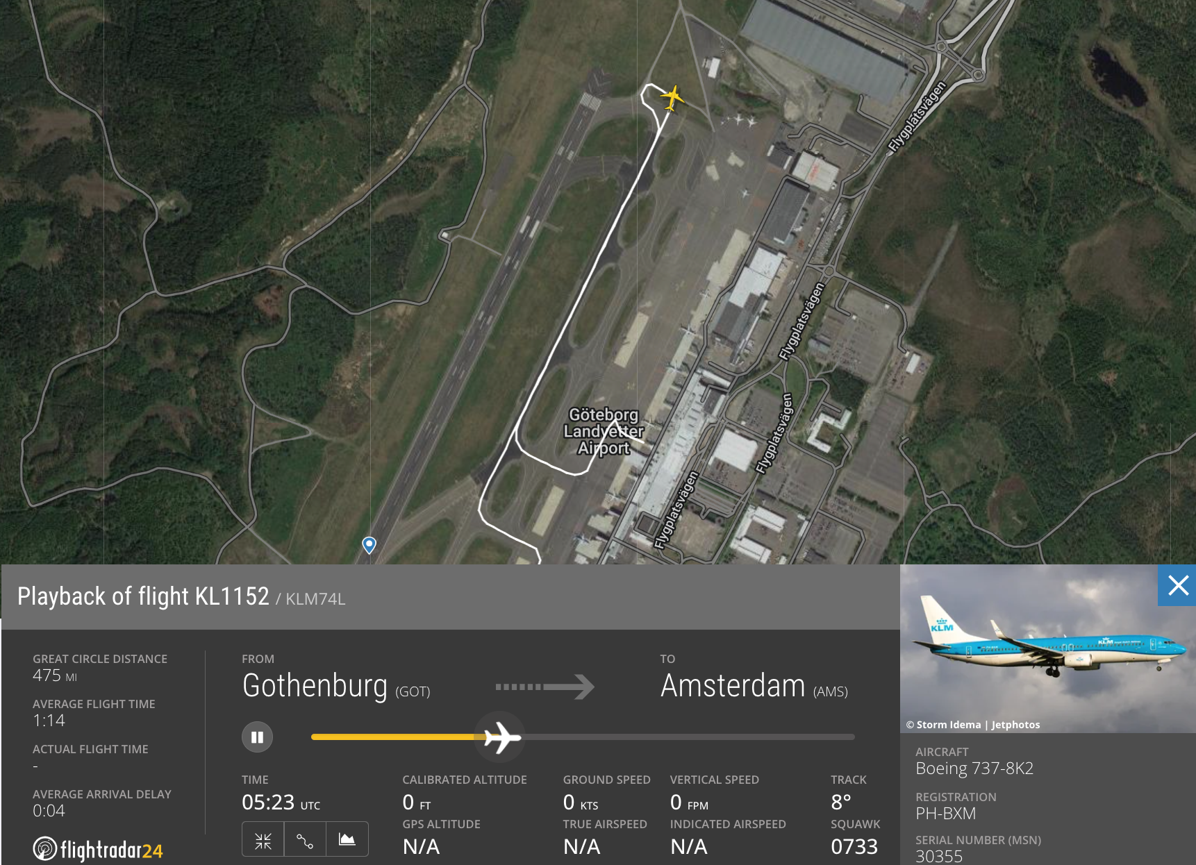 El avión de fuselaje estrecho en cuestión está registrado como PH-BXM y bautizado como Kluut, un Boeing 737-800 de 23 años entregado a la aerolínea de bandera holandesa en noviembre de 2000. A última hora de la noche del 16 de enero, el avión operó como KL 1163 desde el aeropuerto Schiphol de Ámsterdam al aeropuerto Landvetter de Gotemburgo, un vuelo diario programado en el que el avión aterrizó aproximadamente a las 22:27.