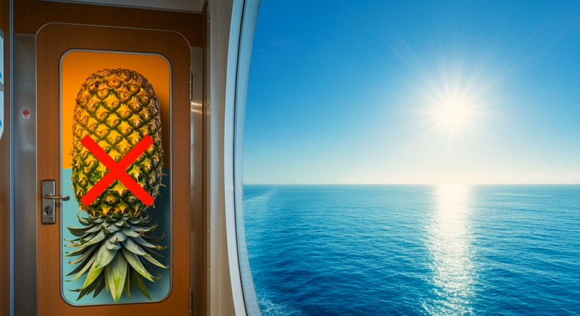 Decoración de puerta de piña al revés en la puerta de la cabina de un camarote de crucero que está prohibidaCrédito: Shutterstock AI