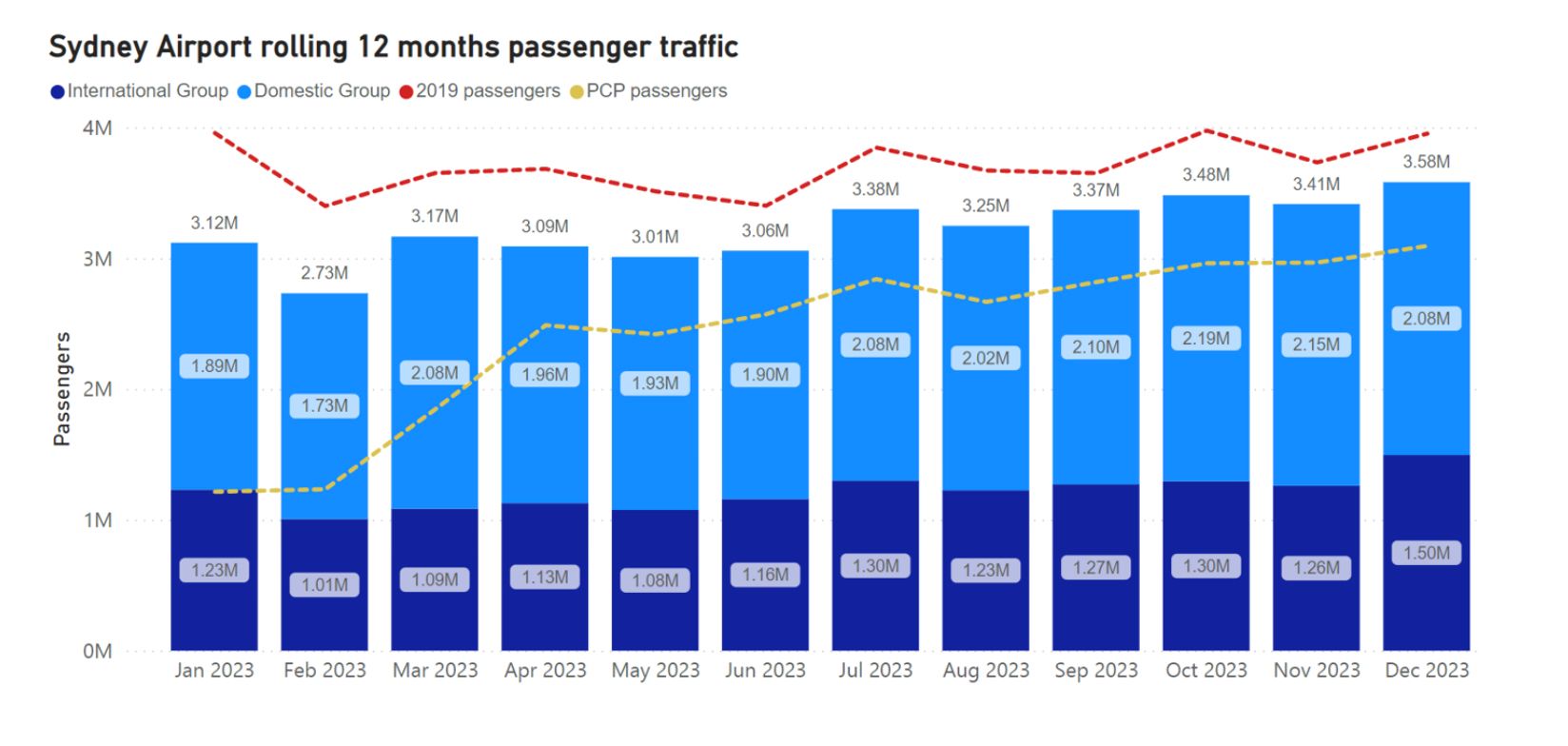 Diciembre cerró un año en el que más de 38 millones de pasajeros pasaron por el aeropuerto de Sydney, lo que fue solo un 13 % menos que el récord de 44,4 millones establecido en 2019. Diciembre de 2023 también fue el primer mes en el que el número reportado de viajeros con pasaportes australianos se recuperó y superó los niveles anteriores a la COVID, creciendo un 1,3 % en comparación con el mismo mes de 2019.
