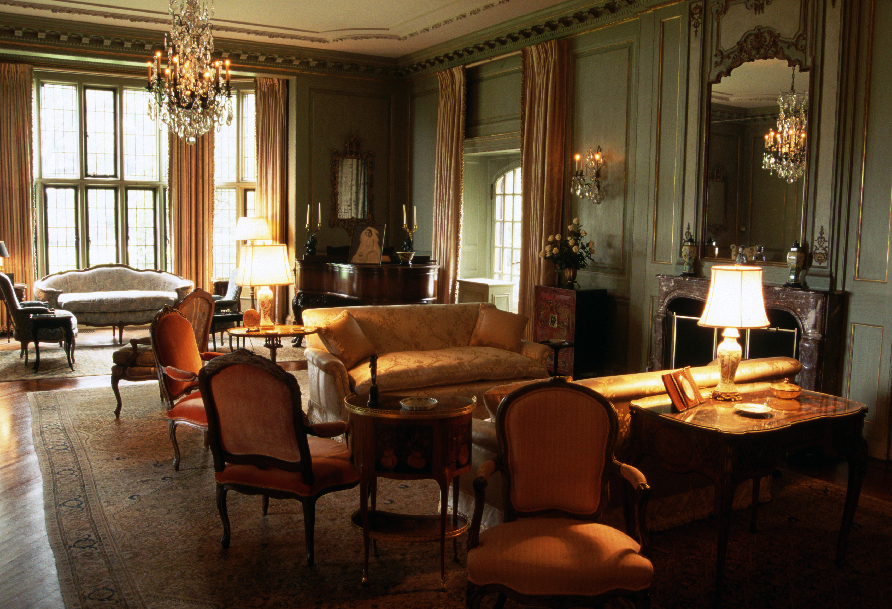 De manera singular, gran parte del interior está revestido con paneles de madera y chimeneas que fueron extraídas de antiguas casas señoriales inglesas y luego enviadas a los EE. UU.