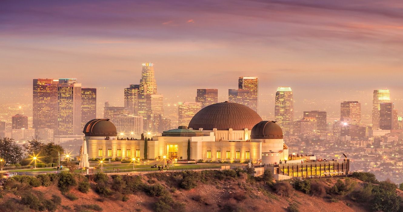 El Observatorio Griffith al atardecer con el horizonte de la ciudad de Los Ángeles al fondo, Los Ángeles, California, Estados Unidos