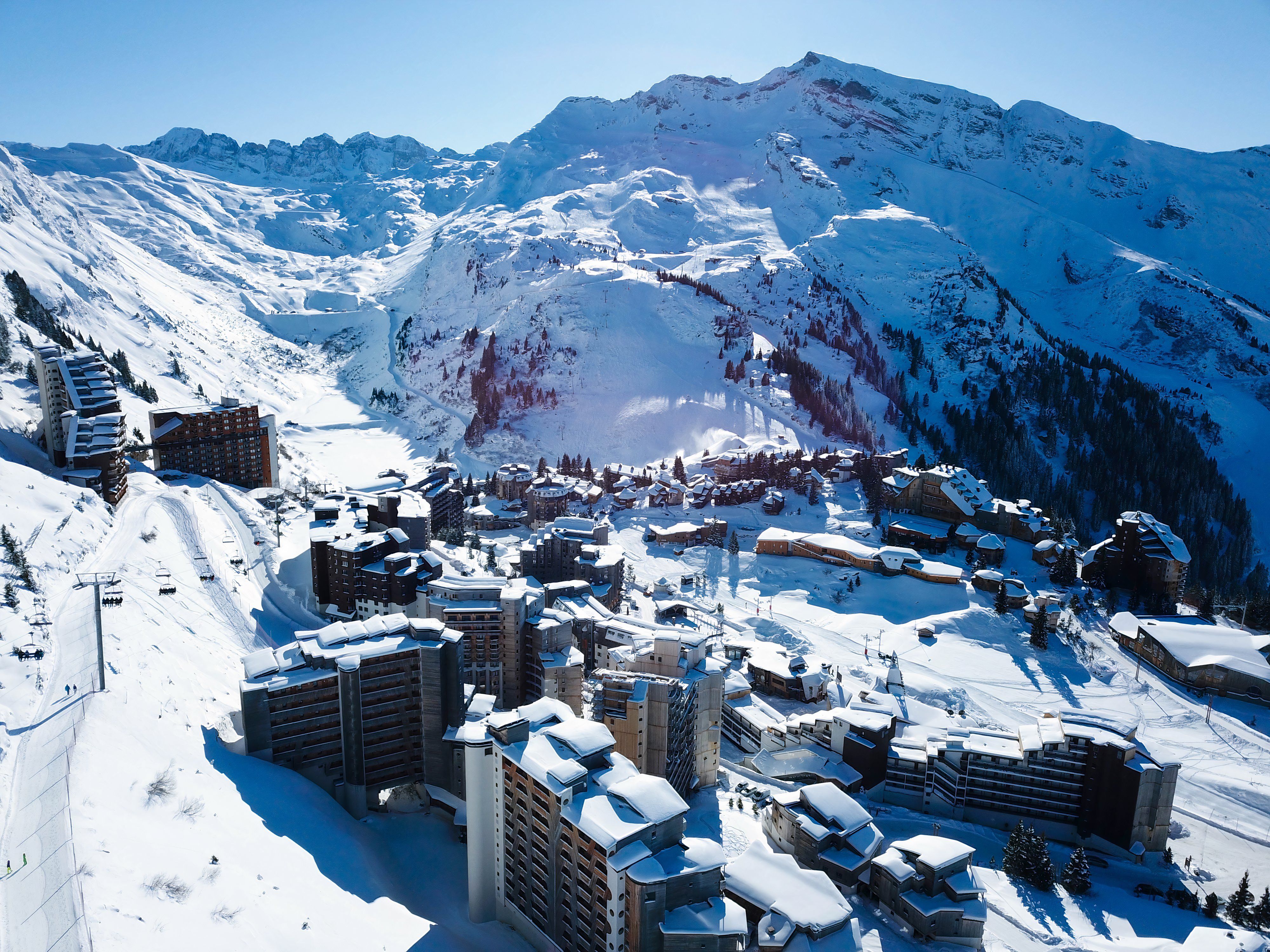 Morzine, Alpes franceses, ciudad turística de nieve, vista aérea.
