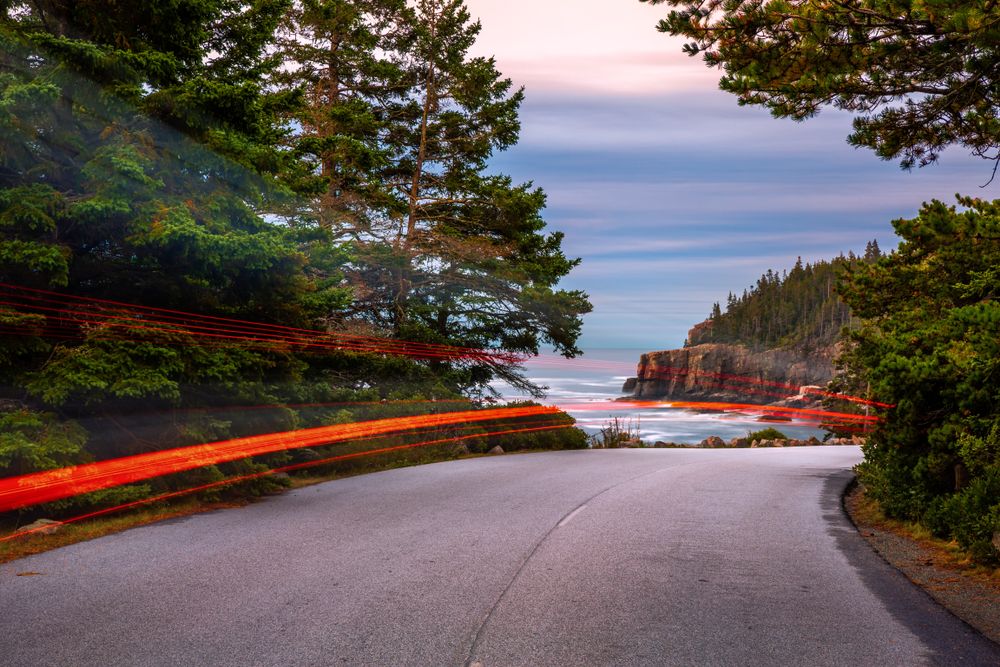 Park Loop Road al anochecer, con estelas de luz, en el Parque Nacional Acadia, Maine