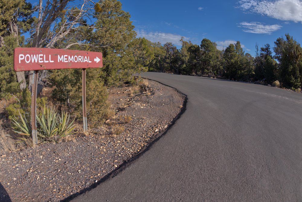 El letrero que marca el camino de entrada al Powell Memorial desde el estacionamiento de Hermit Road