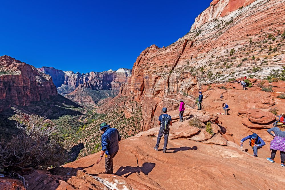 Los excursionistas disfrutando de la vista en el punto de observación, el Parque Nacional Zion, Utah, EE.UU.