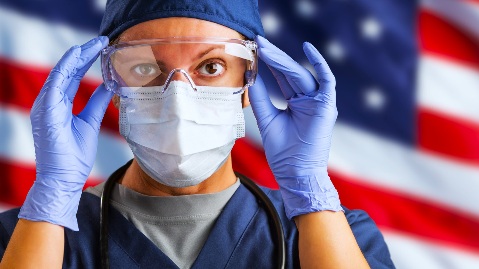 Una enfermera se para frente a una bandera de EE. UU. mientras usa una máscara y EPI.