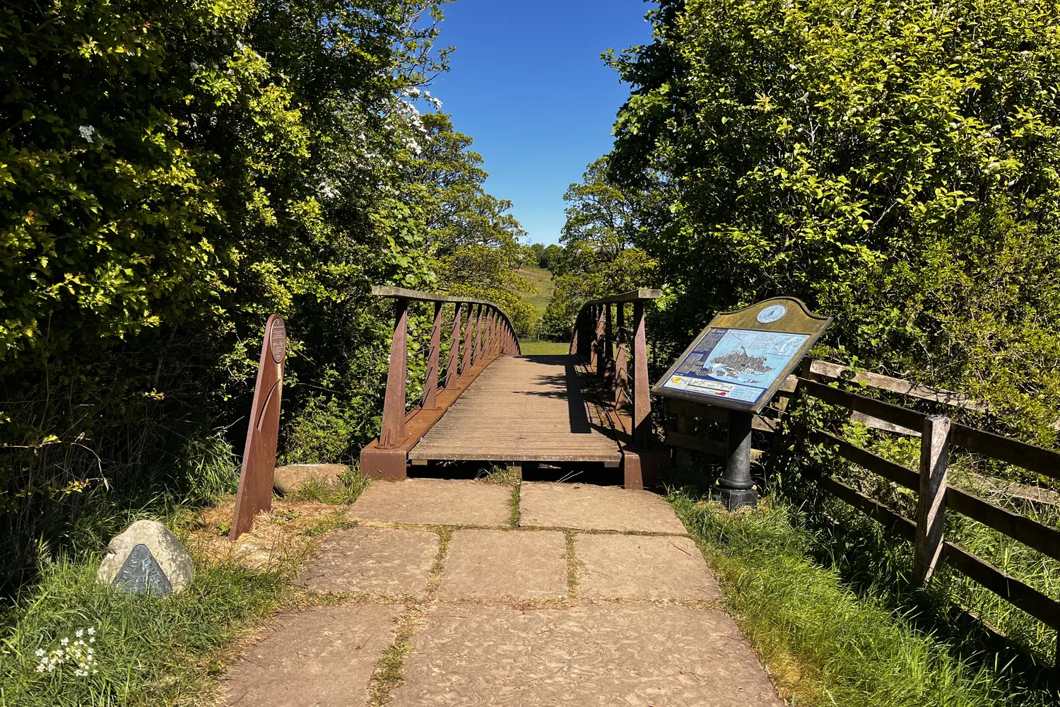 El tercer tipo de marcador de orientación (más común en las partes central y oriental del sendero) es una insignia pequeña, redonda, amarilla y verde que dice "Sendero Nacional del Camino del Muro de Adriano" alrededor del borde. Al igual que la bellota, las encontrarás en escaleras, puertas y empotradas en vallas de piedra.
