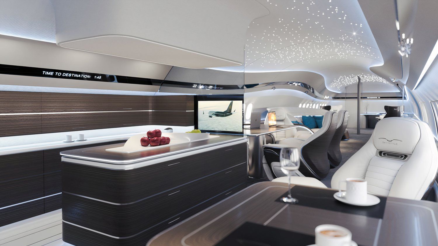 - Un concepto de hotel volador:Con una superficie de más de 1100 pies cuadrados, el avión cuenta con todo lo que ofrecería un hotel de lujo y mucho más.