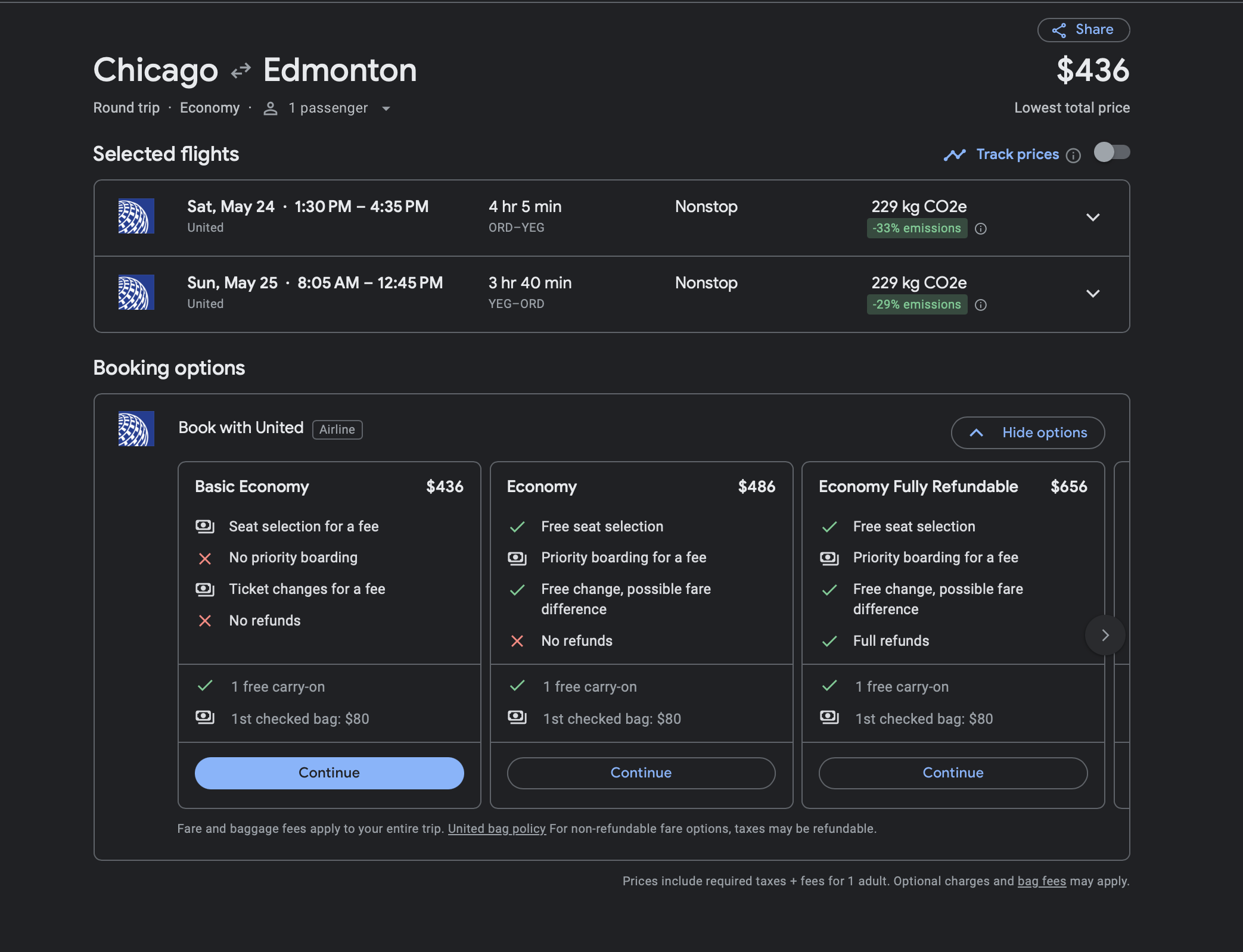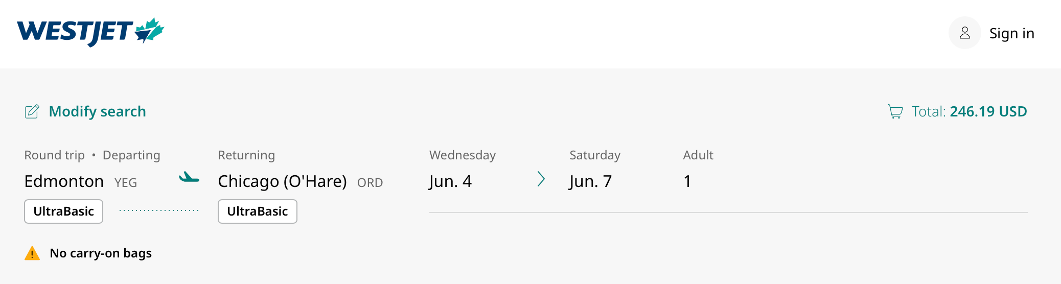 El sitio web de WestJet muestra el primer vuelo de Edmonton a Chicago el 4 de junio. Pero en la dirección opuesta, no hay ningún vuelo programado hasta el sábado 7 de junio. Los precios para el viaje de ida y vuelta comienzan en $246,19, pero a diferencia de United, la tarifa no incluye equipaje de mano.