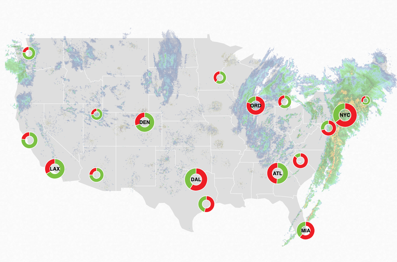 ORD tuvo la mayor cantidad de vuelos cancelados con 109, mientras que los retrasos fueron casi 500. El Aeropuerto Nacional Ronald Reagan de Washington (DCA) tuvo el segundo mayor número de cancelaciones con 63. Le siguieron LGA y CLT, con 52 y 47, respectivamente. A pesar de solo un total de 27 cancelaciones, ATL tenía una importante acumulación de vuelos que salían a tiempo, con 636 retrasos.