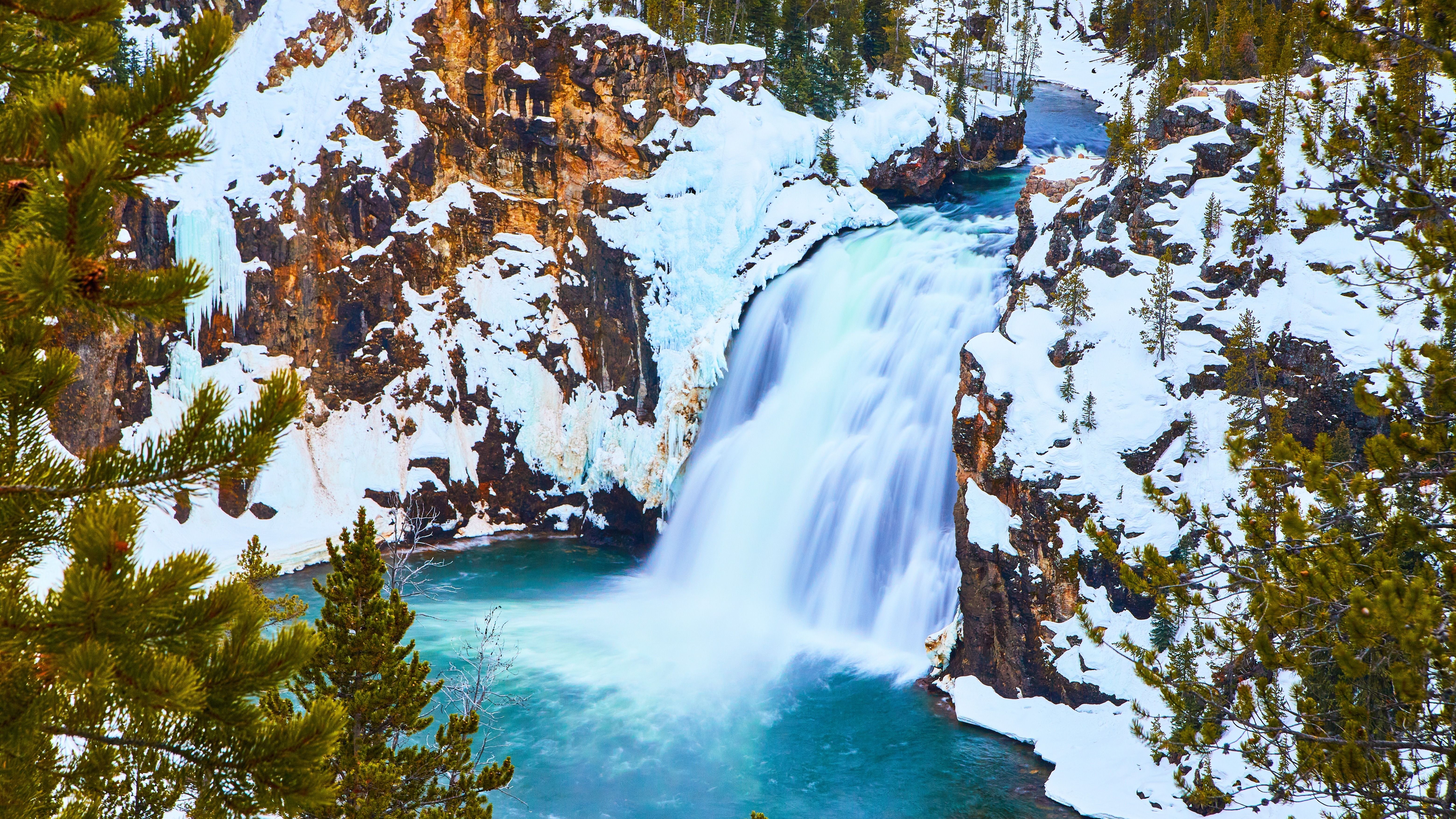 Los pinos enmarcan acantilados nevados e impresionantes cascadas azules en el Parque Nacional de Yellowstone