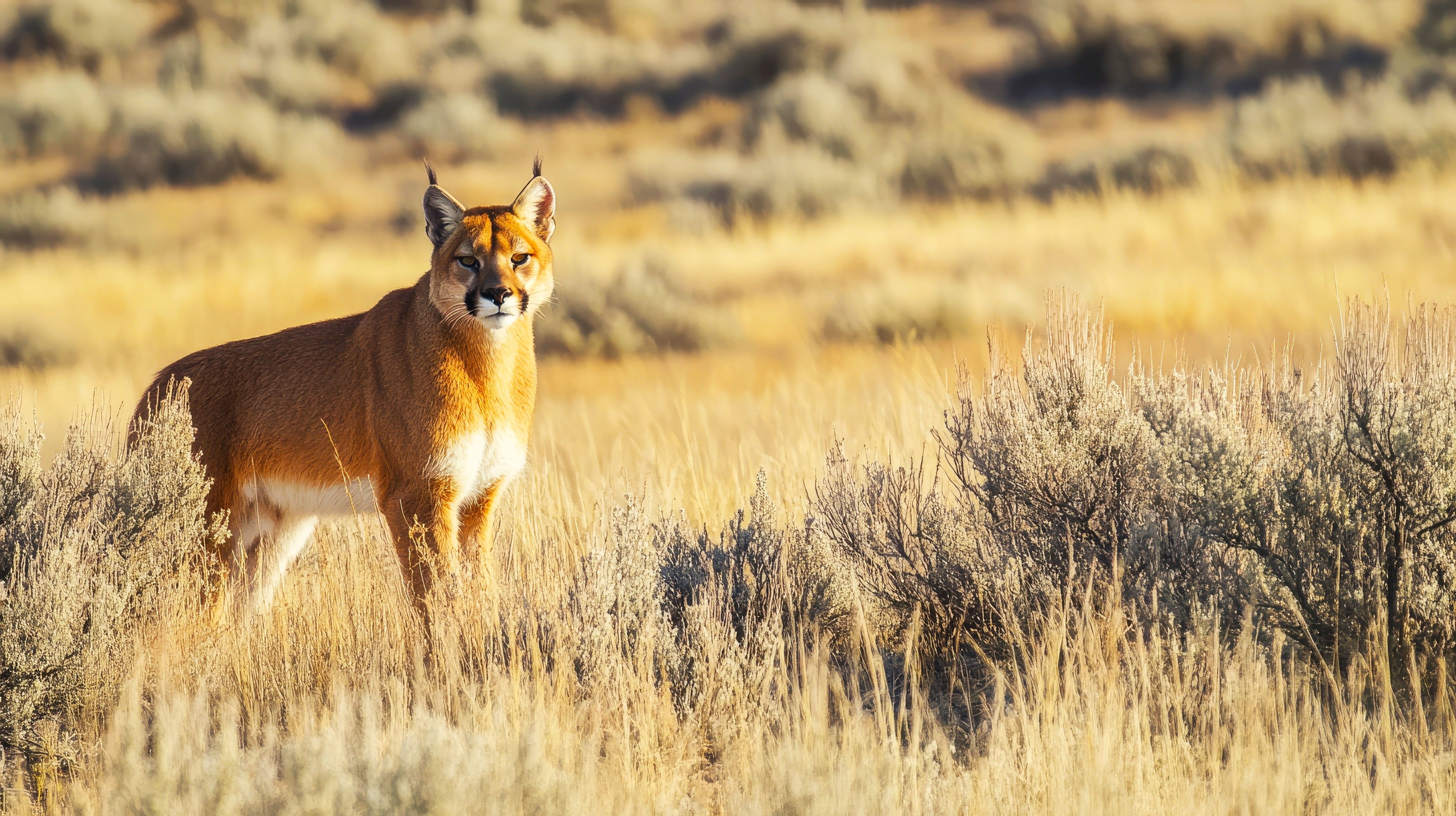 Un puma alerta en un campo de pastos altos y dorados en el Parque Nacional de Yellowstone, EE.UU.