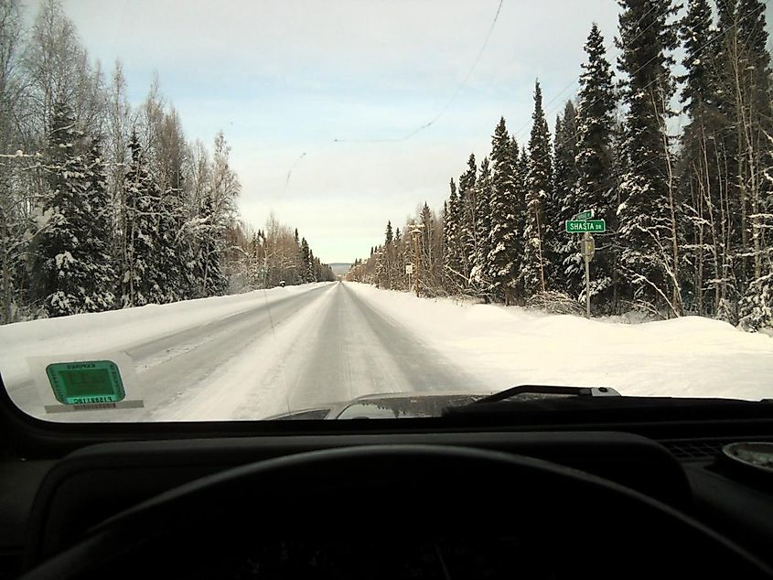 Conduciendo por una nevada Nordale Road cerca de Badger, Alaska. Por Jim O'Neil - CC BY 2.0,Wikimedia Commons.