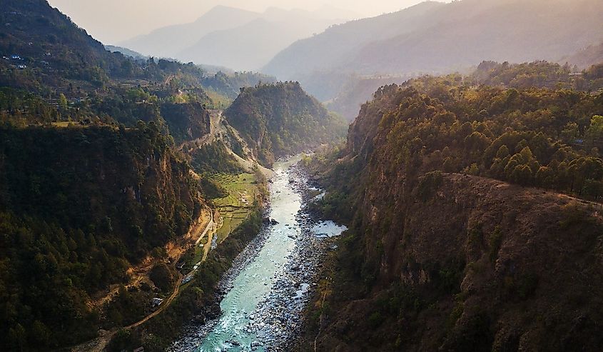 También conocida como Andha Galchi, la garganta de Kali Gandaki es la segunda garganta más profunda del mundo formada por el río Kali Gandaki (un afluente del río Ganges) en el Himalaya de Nepal. El río Kali Gandaki se origina en el glaciar Nhubine Himal, cerca de la frontera tibetana en la región de Mustang en Nepal, a una altura de 20,564 pies. Luego, el río fluye en dirección sur a través de un profundo cañón empinado antes de ensancharse en la pasarela de acero de Chele. Continuando su viaje hacia el sur, el río Kali Gandaki atraviesa el empinado desfiladero de Kali Gandaki, que separa el Dhaulagiri de 29.795 pies de altura en el oeste del Annapurna I de 26.545 pies de altura en el este.