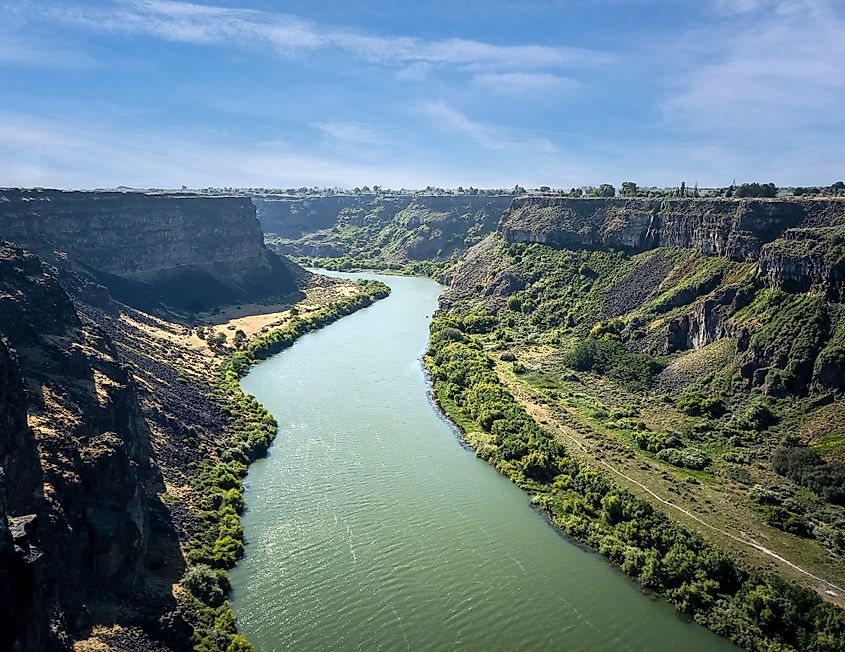 Hells Canyon es un desfiladero del río Snake a lo largo de la frontera entre Idaho y Oregon, que se extiende a lo largo de 125 millas y 40 millas con más de una milla de profundidad. Con una profundidad máxima de 7900 pies, es el desfiladero más profundo de América del Norte. Las paredes muestran tonos amarillos, rojos y naranjas, elevándose dramáticamente en algunos lugares. Después del debate sobre la construcción de represas para controlar las inundaciones, Idaho Power Company construyó tres represas, Brownlee, Oxbow y Hells Canyon, entre 1959 y 1968.