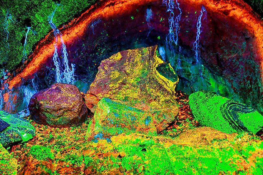 Las rocas fluorescentes de la mina Sterling Hill brillan con vibrantes vetas de luz bajo iluminación ultravioleta.