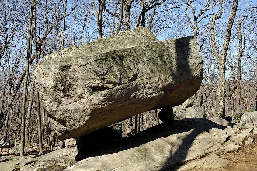 Tripod Rock, un enorme glaciar errático en equilibrio sobre tres piedras más pequeñas, en Pyramid Mountain Park, Nueva Jersey.