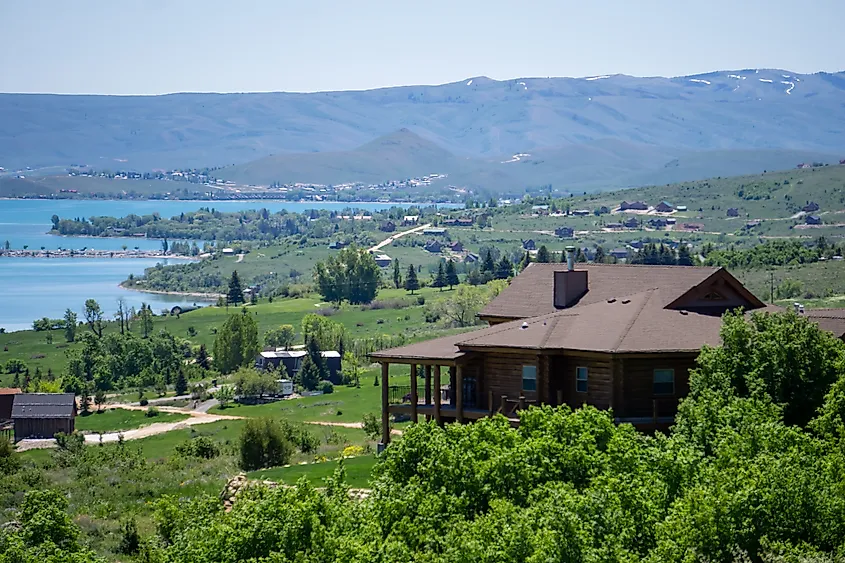 Vista aérea de Garden City, Utah, a orillas del lago Bear.