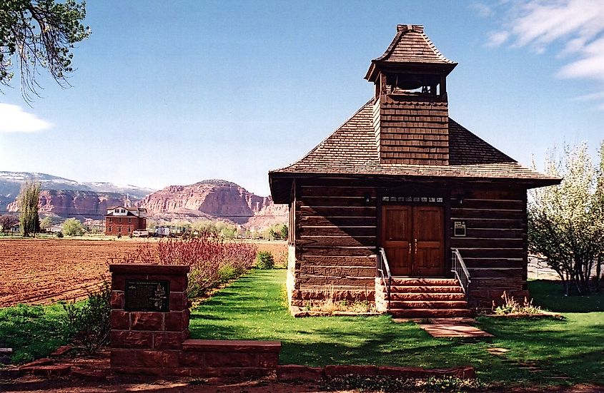 La histórica iglesia-escuela Torrey Log en Torrey, Utah. Crédito de la imagen AE Crane, https://www.byways.org vía Wikimedia Commons