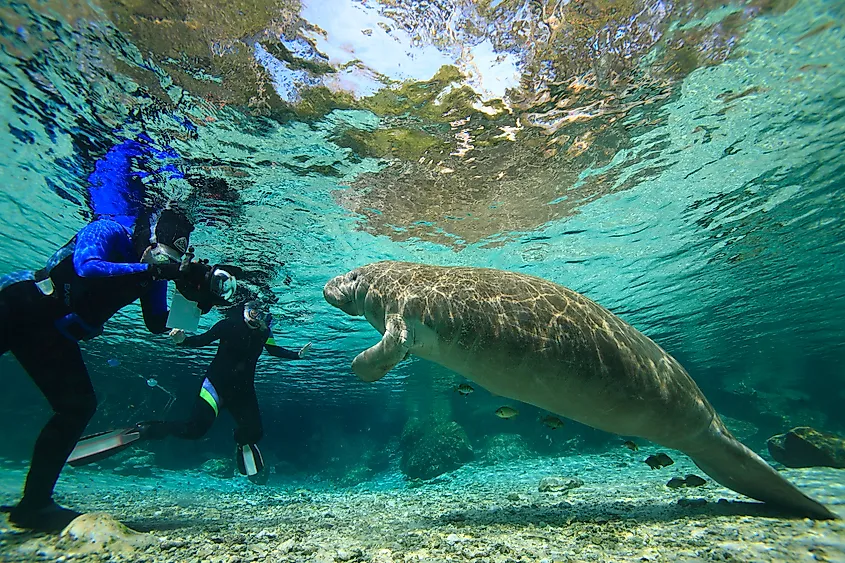 Un buzo fotografiando a los manatíes en Crystal River, Florida.