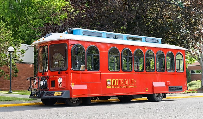 Monmouth Independence Trolley, servicio de autobús local rojo y colorido en el centro de Oregón. Crédito de la imagen Fotografía de Ian Dewar a través de Shutterstock