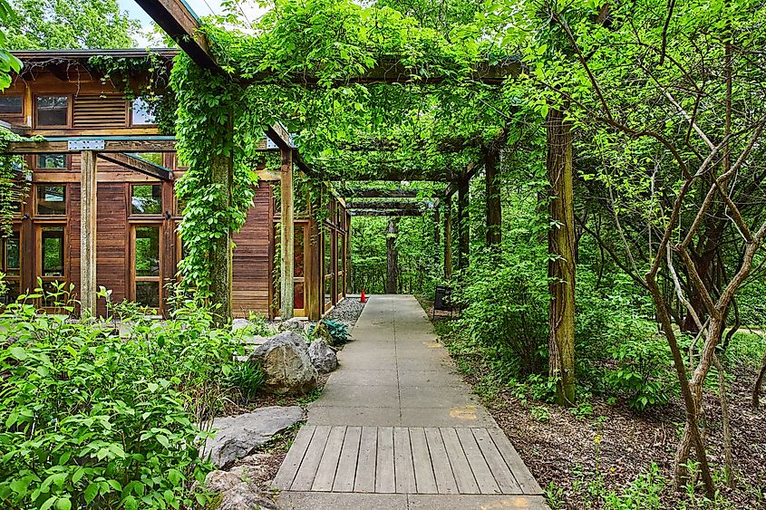 Sendero natural con vides verdes sobre pérgola en Shepherdsville, Kentucky.