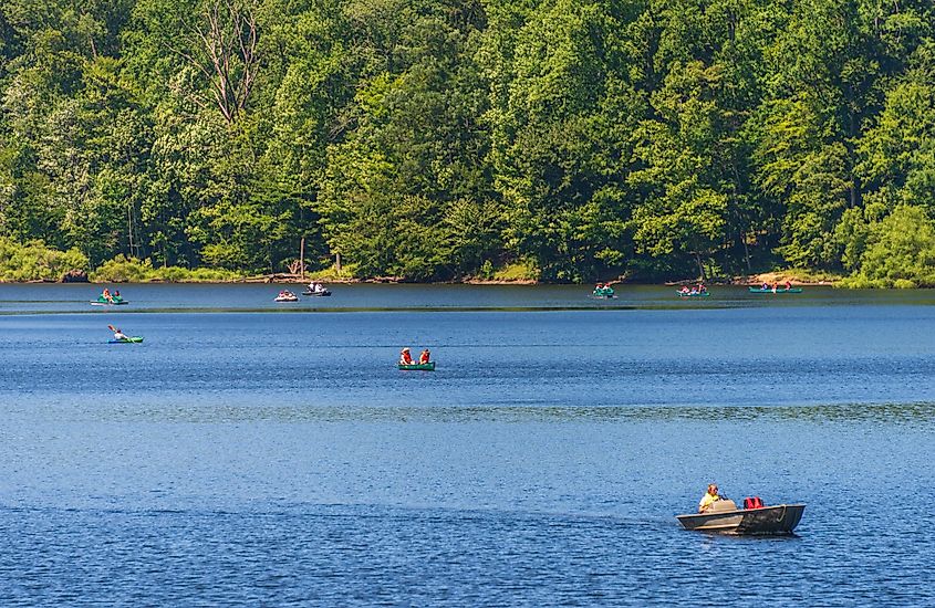 Deep Creek Lake es uno de los destinos recreativos más populares de Maryland, ubicado en el condado de Garrett. Con una superficie de 3900 acres, el lago es un lugar de vacaciones durante todo el año, con muchas cosas que hacer y lugares para disfrutar. Dirígete al Parque Estatal Deep Creek Lake en la costa noreste del lago para vivir una experiencia memorable. Este parque cerca de la ciudad de Frostburg tiene más de 100 lugares para acampar, 20 millas de senderos, una costa de una milla de largo y dos playas para nadar. Con todas estas increíbles instalaciones, los visitantes pueden pasar sus vacaciones aquí paseando en bote, pescando, practicando kayak, piragüismo, haciendo tubing y nadando en el agua o caminando alrededor del lago para observar aves. El parque también cuenta con un centro de descubrimiento donde los visitantes pueden explorar las exhibiciones de plantas y vida silvestre de la zona.