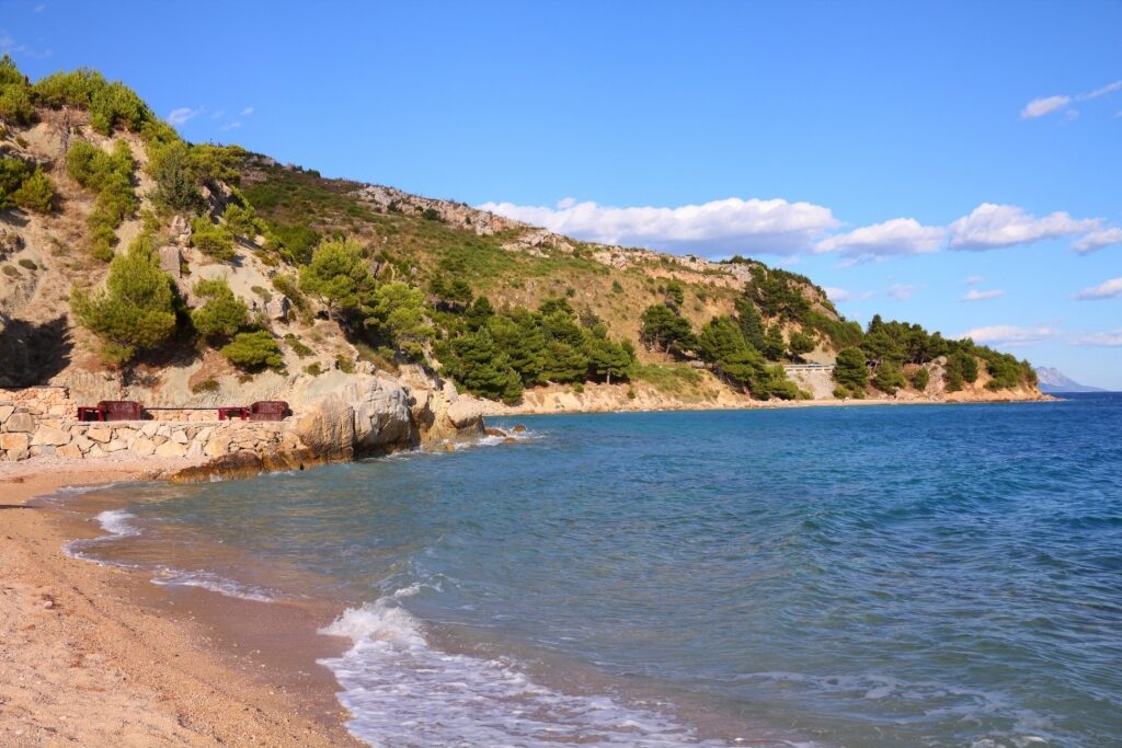 El sol y el mar aguardan en la guijarrosa Plaža Artina, a unos 40 minutos del corazón de Split. Varios caminos diferentes conducen hasta la orilla desde la zona de aparcamiento, y los árboles proporcionan sombra de forma natural.