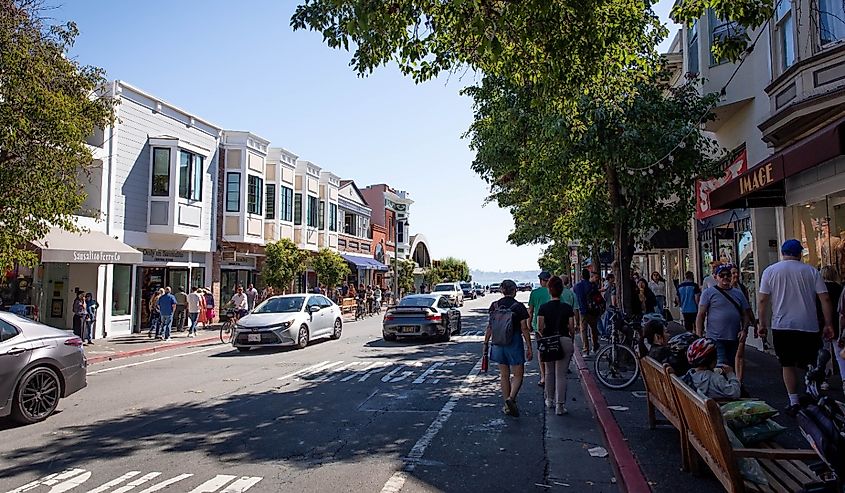 Bridgeway, calle principal con muchas tiendas, cafés y atracciones turísticas en Sausalito, California. Crédito de la imagen bluestork a través de Shutterstock