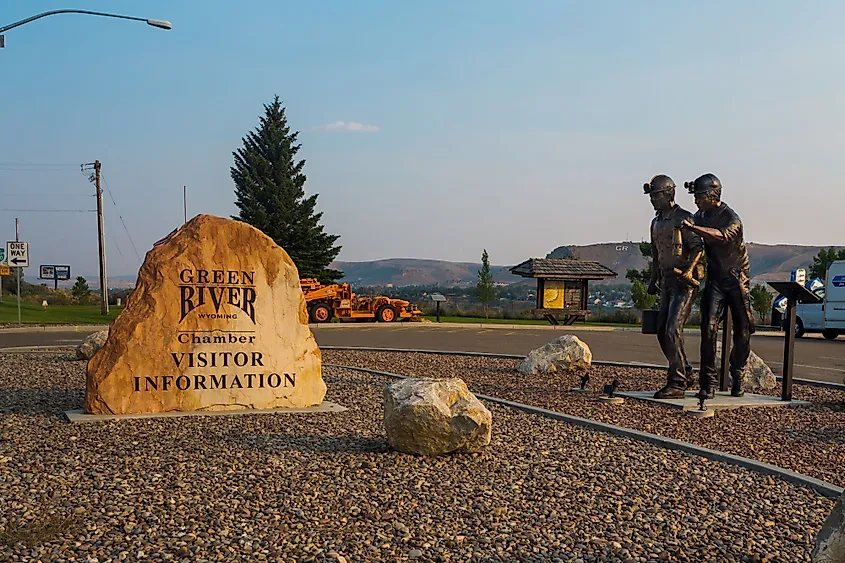 Estatua de dos mineros y centro de visitantes firmar en Green River, Wyoming. Crédito de la imagen Victoria Ditkovsky a través de Shutterstock.com