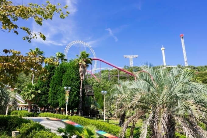Una de las mayores atracciones del parque son sus cuatro montañas rusas, todas las cuales ofrecen experiencias emocionantes con impresionantes vistas del puente Seto Ohashi. Ya sea que estés parado, conduciendo hacia atrás o experimentando caídas pronunciadas, cada viaje está lleno de emoción. Otra atracción popular es el Sky Cycle, un paseo a pedales que lleva a los visitantes a la altura de un edificio de cuatro pisos, ofreciendo emociones y vistas panorámicas.
