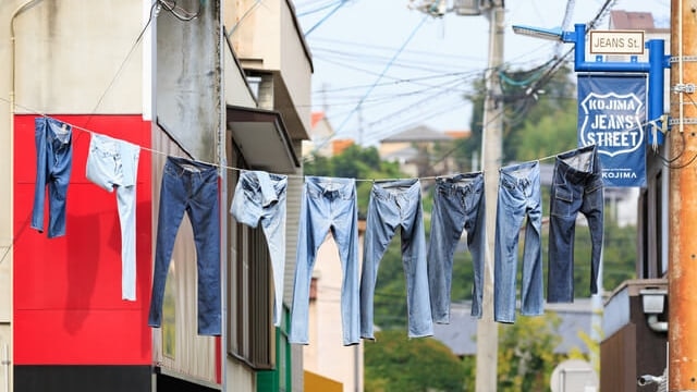 A 15 minutos a pie de la estación JR Kojima, la calle Kojima Jeans es una galería comercial llena de talleres de mezclilla, fábricas de teñido y tiendas especializadas en jeans. Esta elegante calle ofrece de todo, desde mezclilla antigua y vintage hasta diseños japoneses únicos, lo que la convierte en un destino de ensueño para los amantes de la mezclilla.